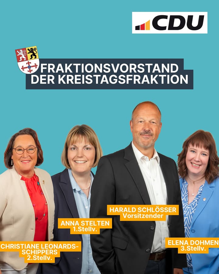 👥 Unser neuer Fraktionsvorstand der CDU-Kreistagsfraktion ist gewählt!💪 Gemeinsam setzen wir uns für eine starke Politik im Kreis ein ? verantwortungsvoll, zukunftsorientiert und nah an den Menschen.👉 Mit Harald Schlösser als Vorsitzendem sowie Anna Stelten, Christiane Leonards-Schippers und Elena Dohmen als Stellvertreterinnen gehen wir motiviert in die kommenden Aufgaben! 🚀✨#CDU #Kreistag #Teamwork #PolitikvorOrt #GemeinsamStark